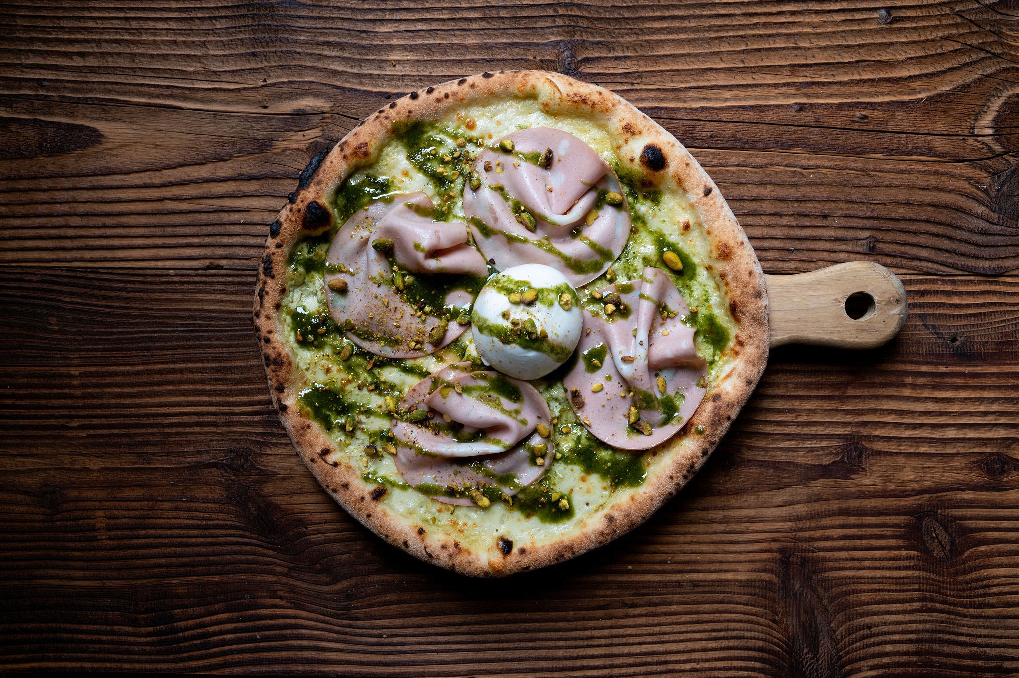 Base crème de pesto, mozzarella, tomates marinées, tomates cerises, mortadelle, burrata, pesto, pistaches concassées.