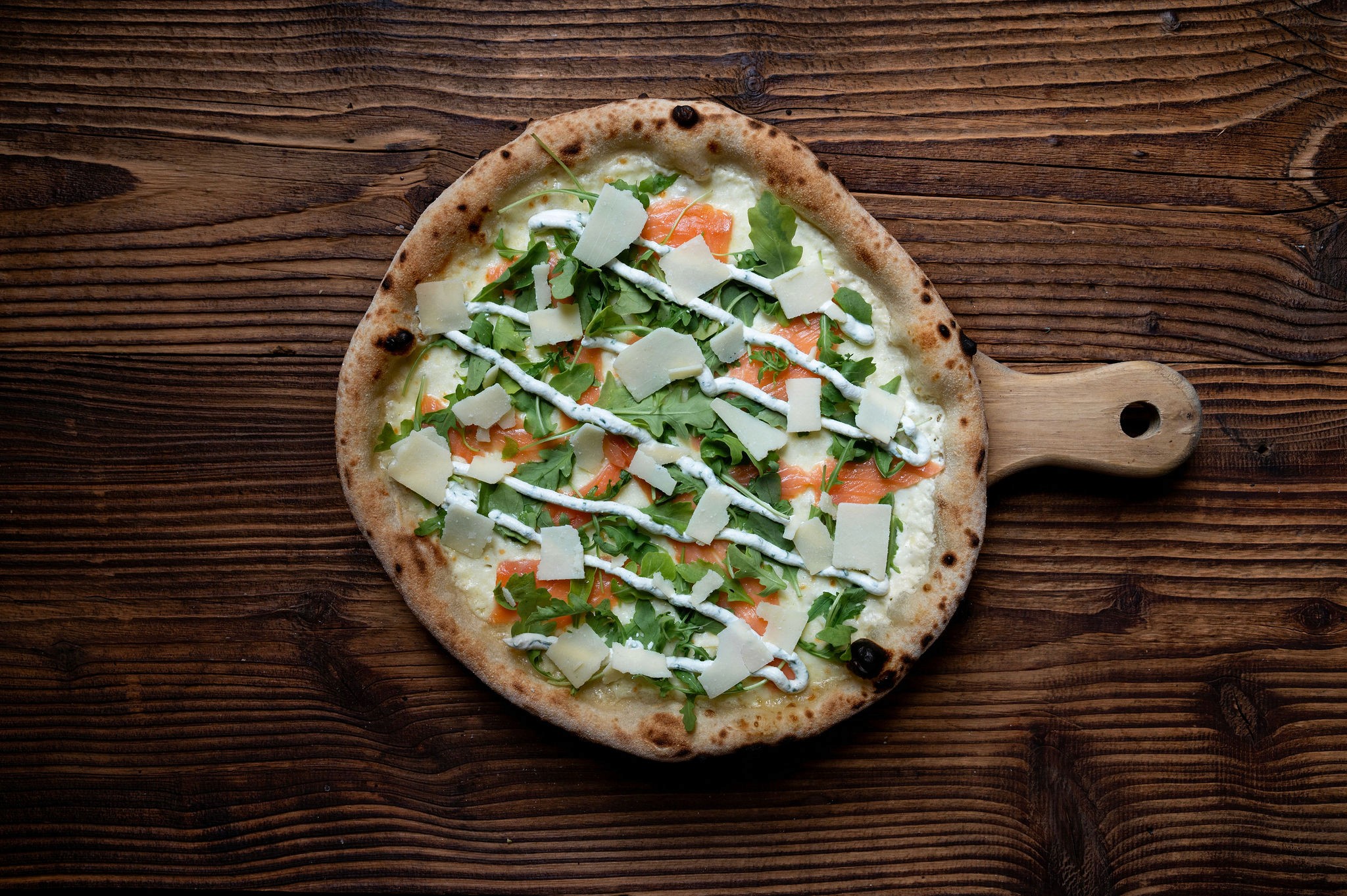 Base crème, mozzarella, crème ricotta-citron-ciboulette maison, saumon, roquette, copeaux de grana padano.
