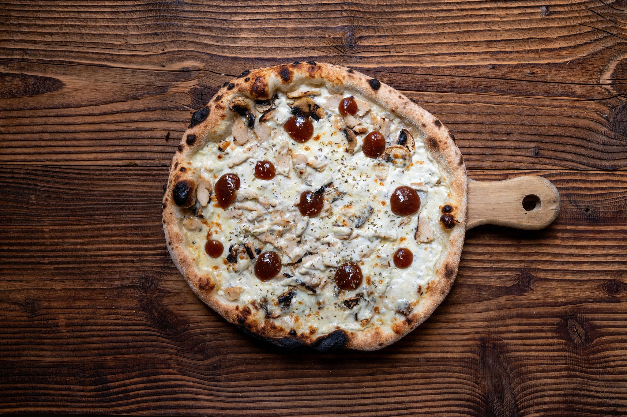 Base crème OU tomate, mozzarella, champignons, émincé de poulet, boursin, confiture de figue à la sortie du four.