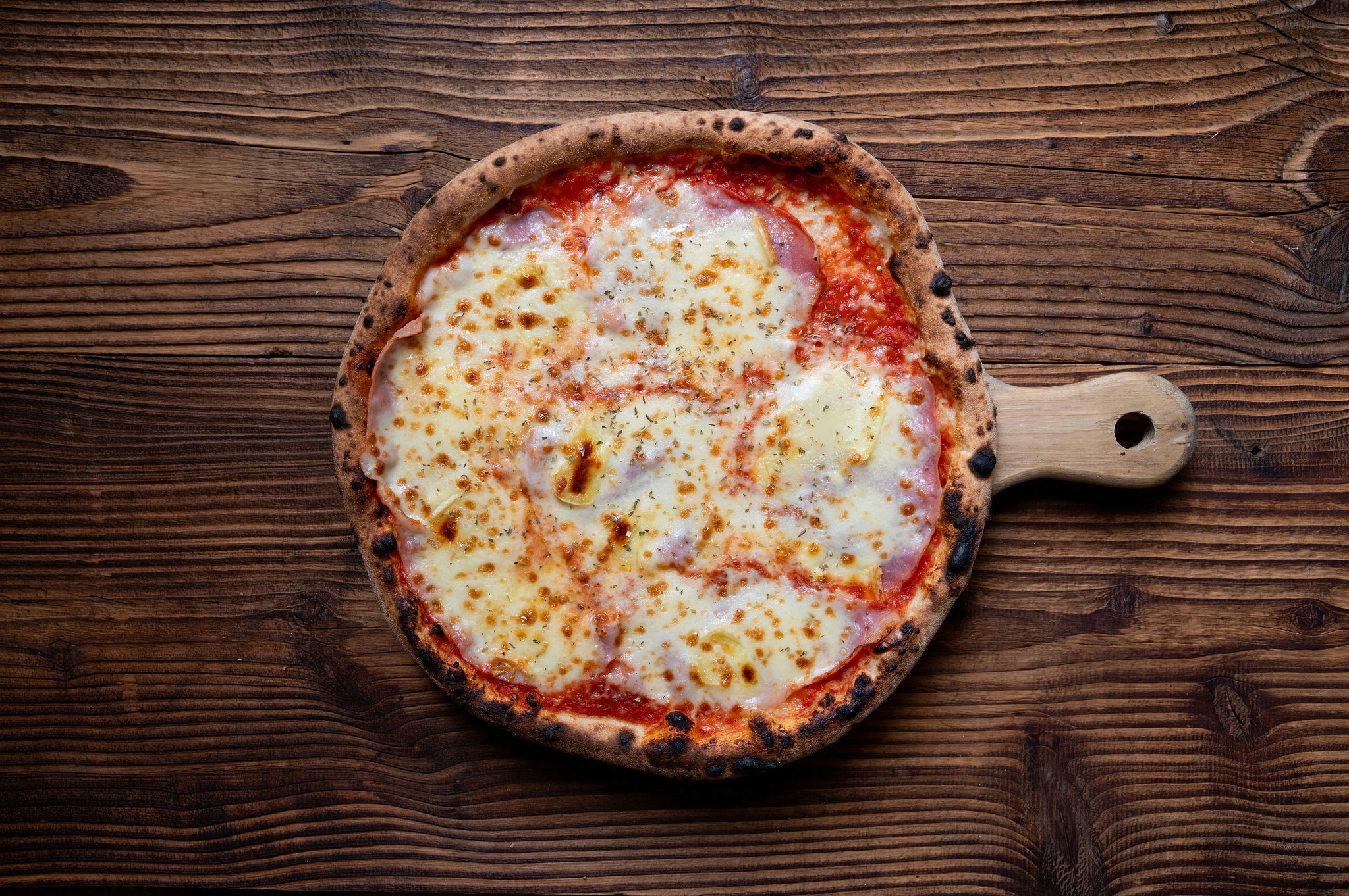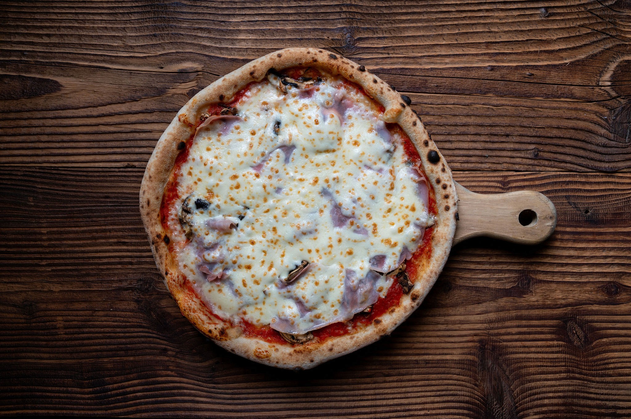 Base tomate, mozzarella, jambon blanc italien, champignons.