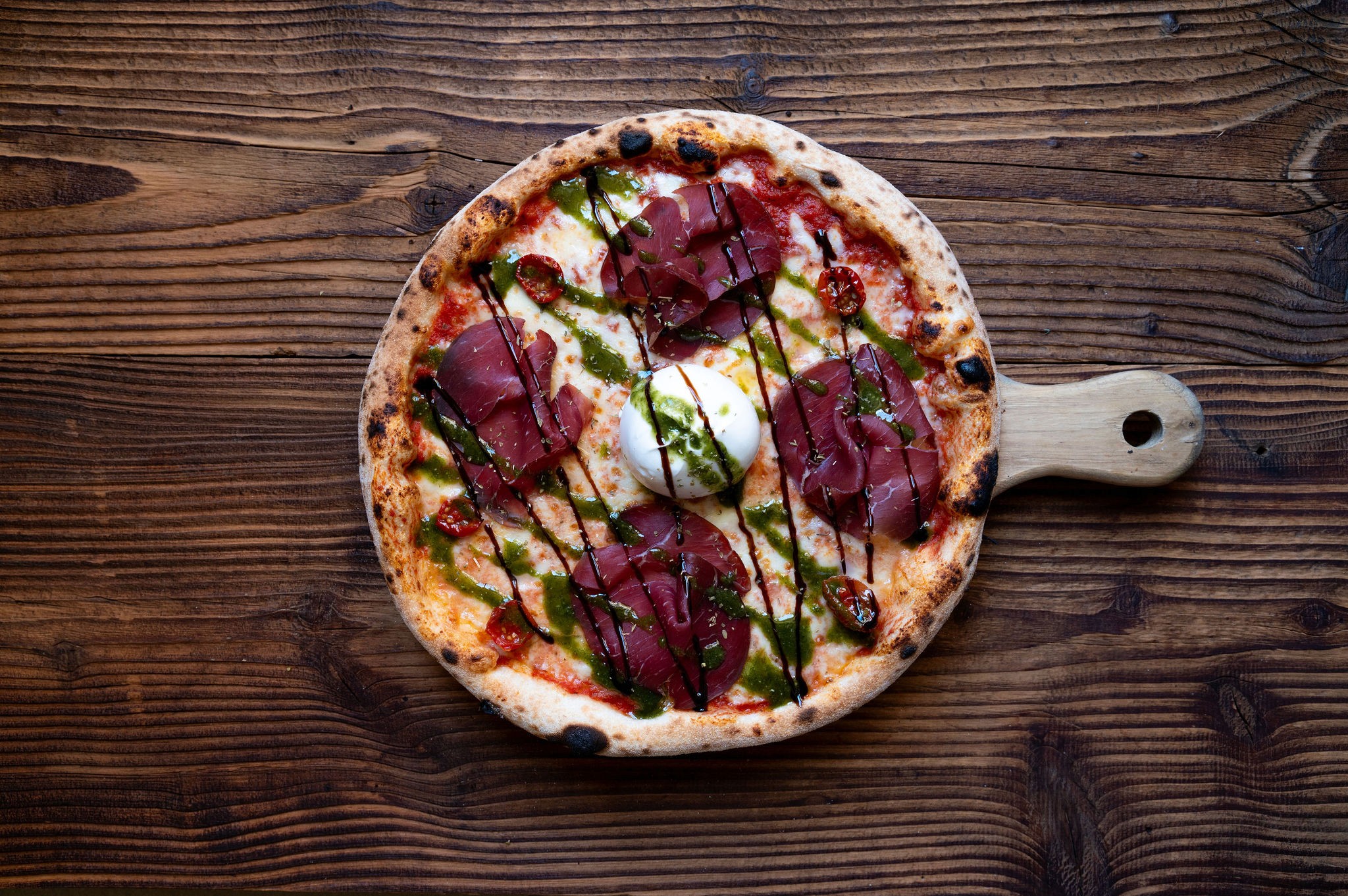 Base tomate OU crème, mozzarella, tomates marinées, bresaola italienne, burrata italienne, crème de balsamique italienne, pesto maison