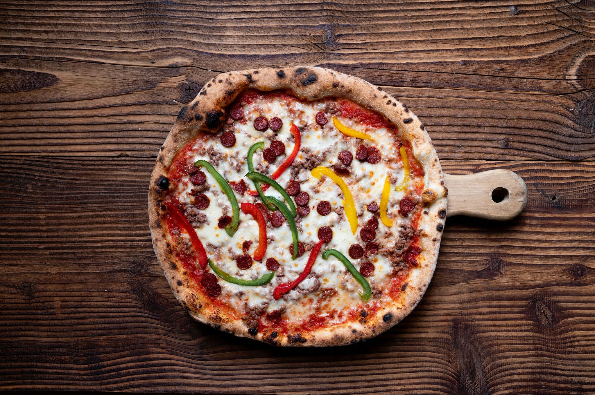 Base tomate, mozzarella, viande hachée, spianata picante italienne, merguez, poivrons.