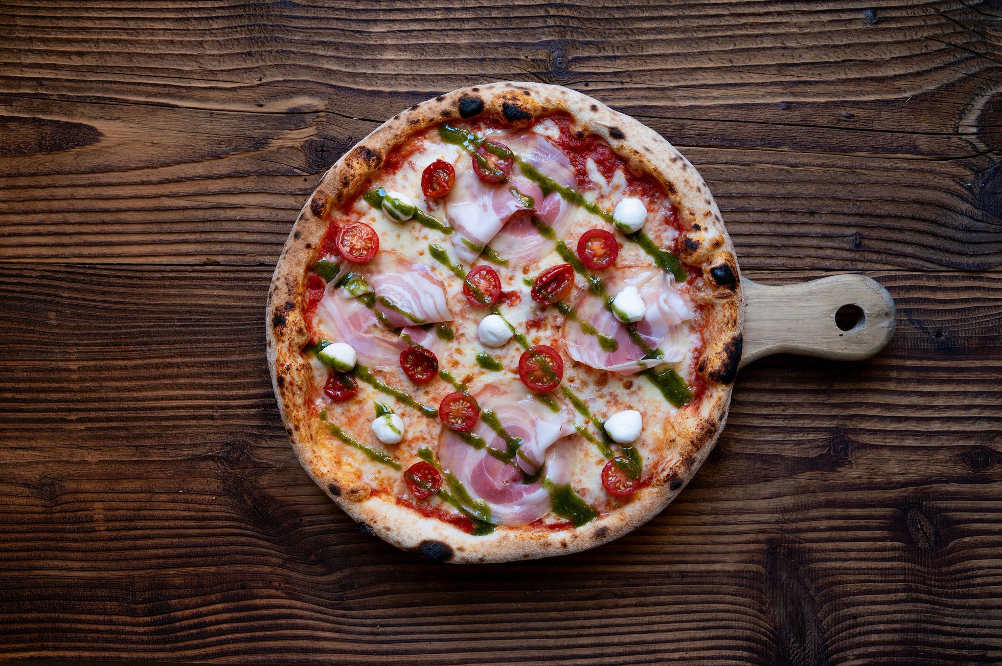 Base tomate, mozzarella, pancetta italienne, tomates marinées, billes de mozzarella, tomates cerises, pesto maison