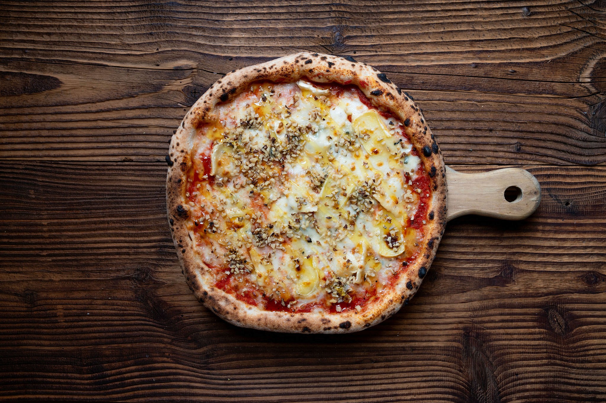 Base tomate, mozzarella, reblochon, chèvre, gorgonzola.