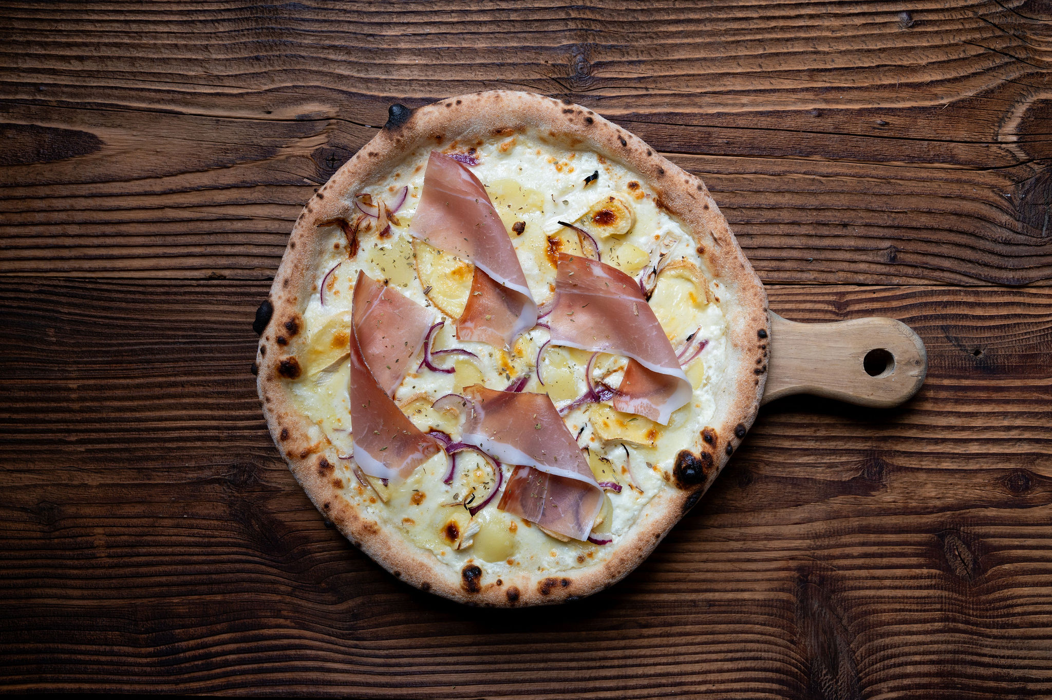 Base crème, mozzarella, patates, reblochon, oignons, raclette et jambon cru italien à la sortie du four