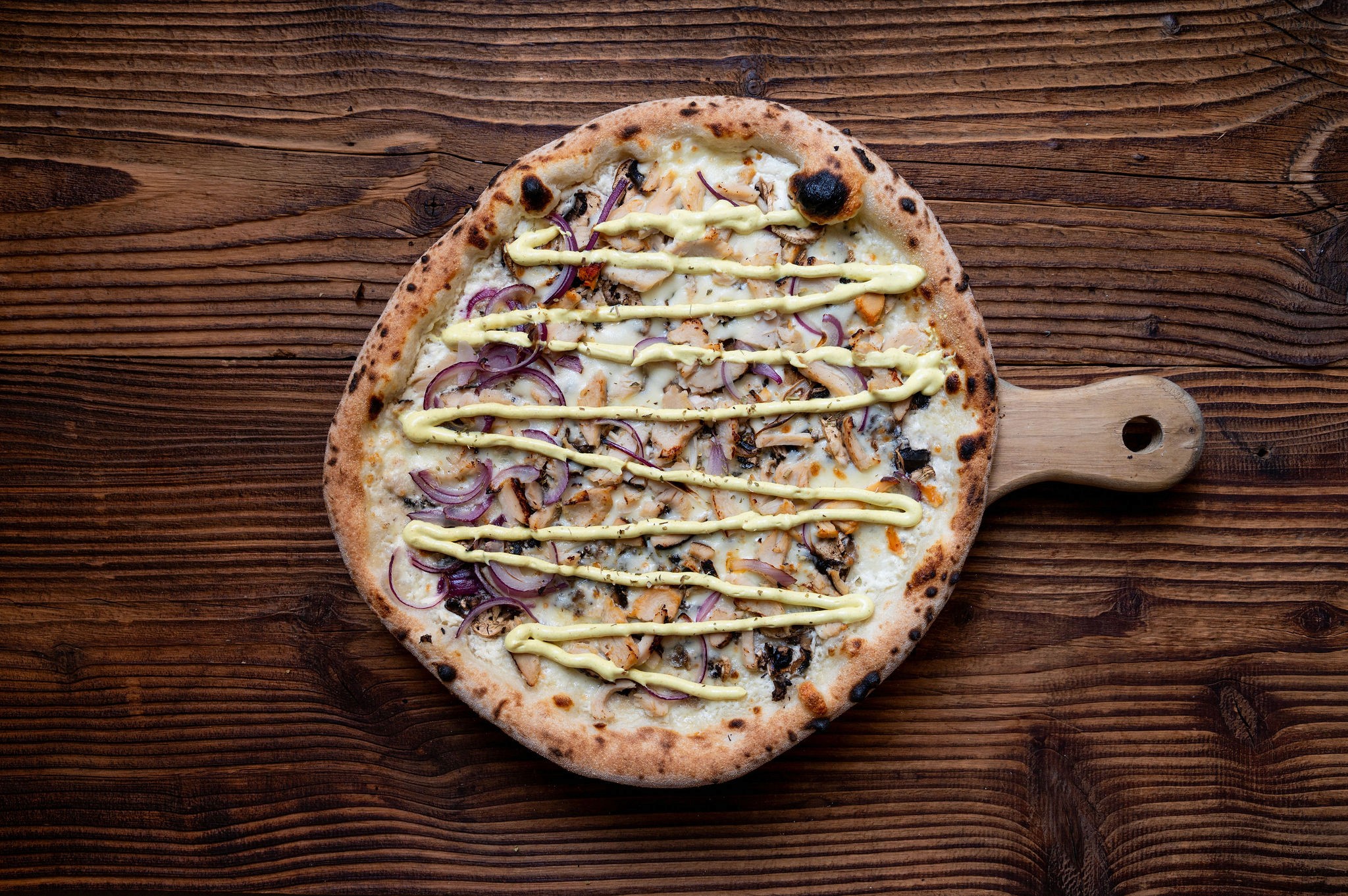 Base crème, mozzarella, champignons, émincé de poulet, oignons, sauce curry maison à la sortie du four.